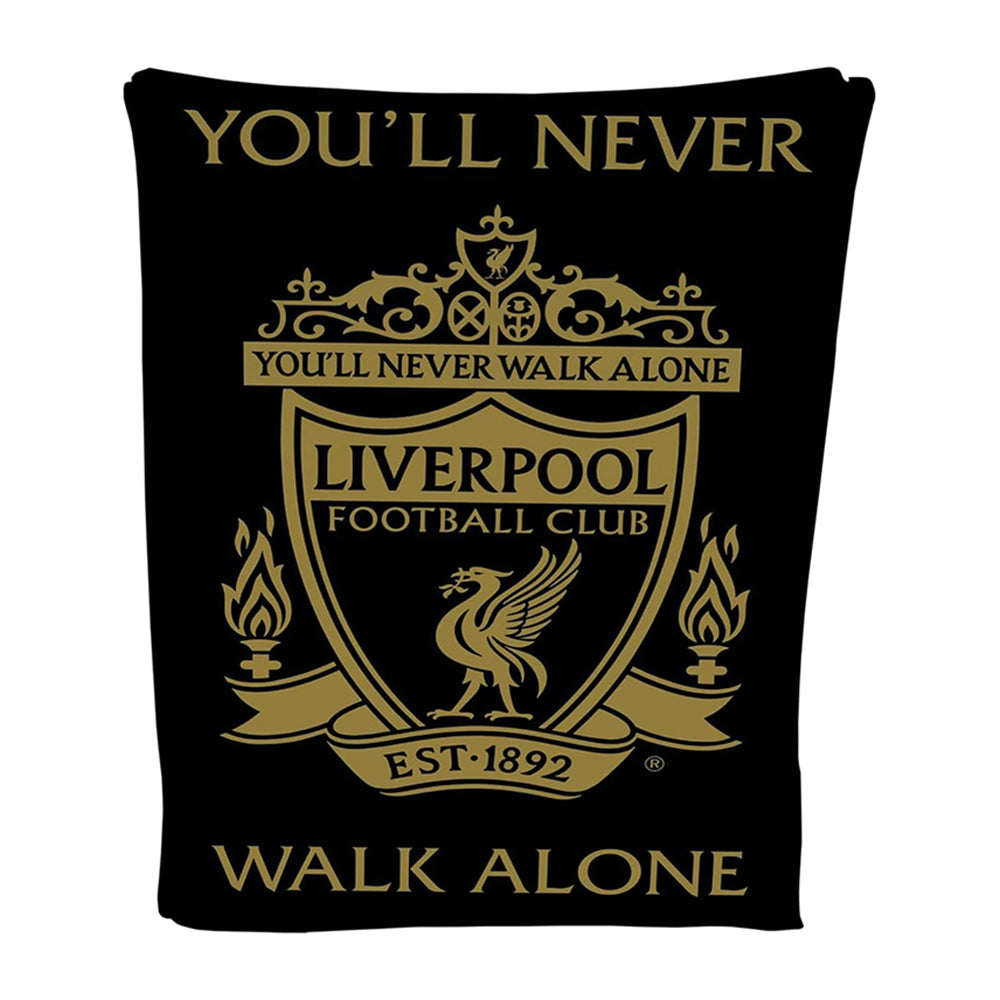 Houd jezelf warm terwijl je liefde voor Liverpool FC toont met dit stijlvolle fleece deken! 🛋️ Met een strak zwart design, het iconische gouden Liverpool-logo en de inspirerende slogan "You'll Never Walk Alone" is dit een onmisbare must-have voor elke fan. ✨