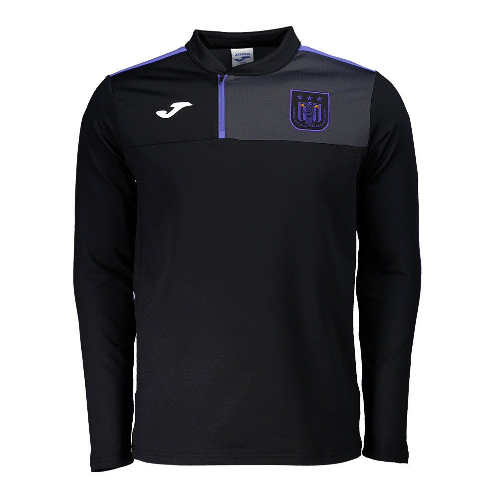Strak Zwart met Functionele Zip: De RSC Anderlecht Zwarte Sweater met Kleine Zip brengt stijl en functionaliteit samen in één kledingstuk. Het strakke zwarte ontwerp vormt een krachtige achtergrond voor het clublogo, terwijl de kleine rits bij de hals zorgt voor een moderne touch en extra ventilatieopties.